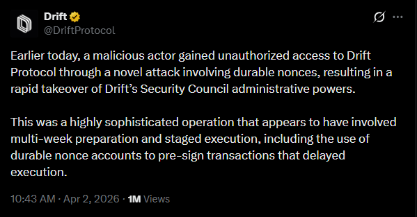 - Drift confirms a $280M exploit tied to a planned admin takeover using pre-approved multisig transactions