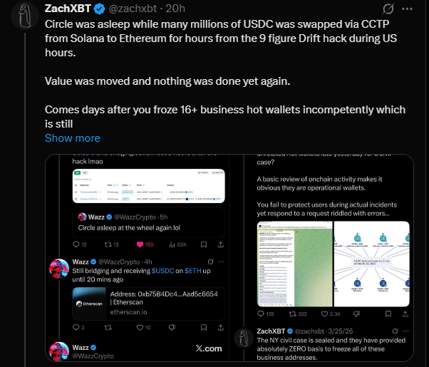He added more context around this incident : " $230M+ USDC bridged via CCTP from Solana to Ethereum across 100+ txns. 6 hours is how long Circle had to freeze stolen funds from the $280M+ Drift hack." The criticism is direct to circle and the claim is that there was enough time to act, but no intervention came during that window. Especially when a centralized issuer like Circle has the ability to freeze assets. So far, Circle hasn't publicly responded to these claims.