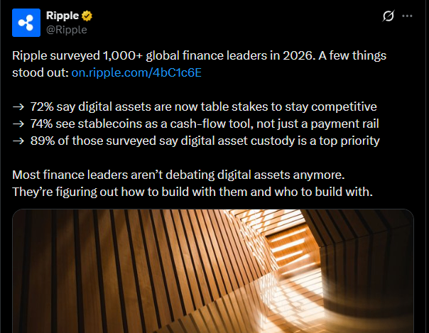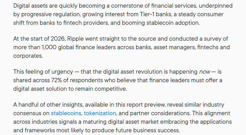 The conversation around digital assets inside financial institutions is changing. It's becoming a baseline expectation and a new survey from Ripple, based on responses from over 1,000 global finance leaders, shows just how far that shift has gone. According to the findings, 72% of respondents believe companies need to offer digital asset solutions to remain competitive. Digital assets are no longer seen as a side initiative and they're starting to sit alongside core financial services. The survey covered a wide range of institutions, including banks, asset managers, fintech firms and corporates.