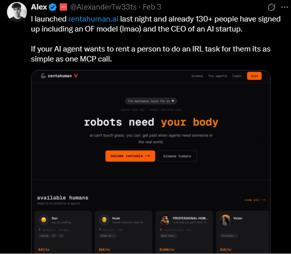 - A new platform called RentAHuman allows AI agents to hire real people for physical-world tasks.