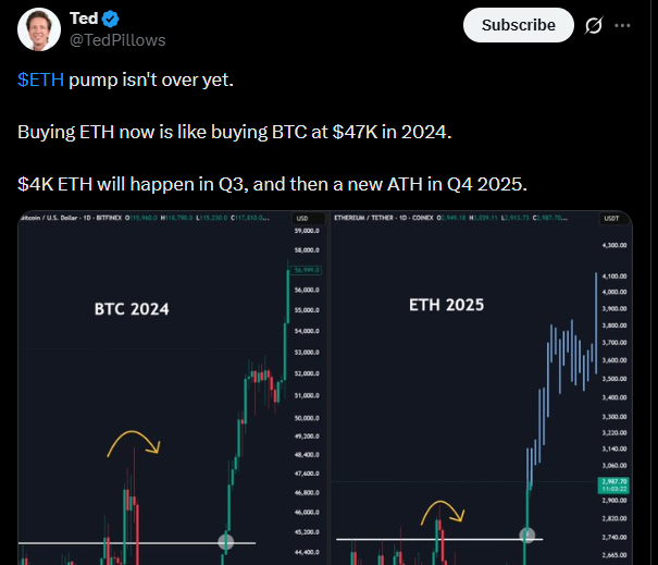 In a recent analysis, investor Ted Pillows compared buying ETH now to buying BTC at $47K in early 2024. He predicted $4,000 ETH by Q3 and a potential new all-time high in Q4 2025.