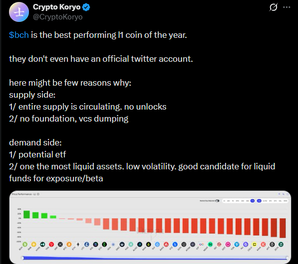 Yet, despite this low-key profile, BCH has managed to outperform chains that have far larger ecosystems, more developers, and significantly higher levels of daily attention. Koryo attributes this strength to a mix of clean supply mechanics and emerging demand-side catalysts.