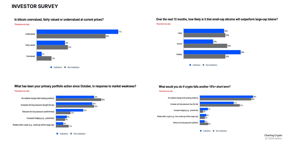 Despite this divergence, only a small minority of institutions believe Bitcoin is overpriced. About a quarter of institutional investors said Bitcoin was fairly valued during the survey period, when prices largely stayed within the $85,000 to $95,000 range. Just 4% of respondents said Bitcoin was overvalued.