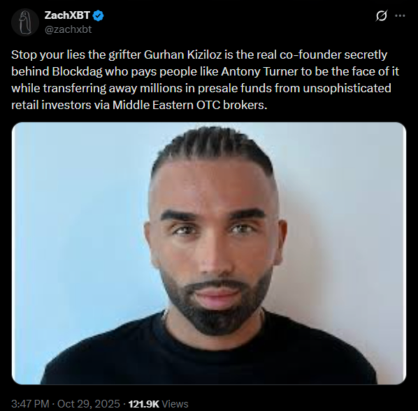 29 Oct 2025, These concerns intensified after crypto investigator ZachXBT published a series of posts examining BlockDAG's origins. According to the analyst, the individual presented as the project's CEO may not actually be its founder. ZachXBT claimed that BlockDAG's supposed CEO was merely a paid frontman for Gurhan Kiziloz, a British entrepreneur previously linked to failed fintech and crypto ventures.