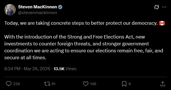Canada is once again stepping into the crypto policy debate, this time with a sharper focus on election security. A newly proposed bill, the Strong and Free Elections Act, aims to completely ban cryptocurrency donations to political parties and entities involved in elections. The reasoning is straightforward but serious. Officials believe crypto's pseudonymous nature could allow foreign actors to influence domestic elections without being easily traced. Alongside crypto, the bill also targets other payment methods like money orders and prepaid cards-tools often associated with limited transparency. In a statement shared on X, government house leader Steven MacKinnon framed the move as part of a broader effort to safeguard democracy: