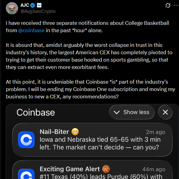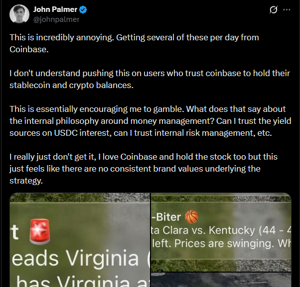 - Coinbase users are pushing back against repeated notifications promoting prediction market bets