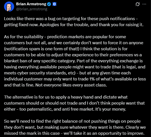 The timing of this controversy adds another layer. Prediction markets are already under scrutiny in the United States, with several lawsuits filed by state regulators. Meanwhile, the Commodity Futures Trading Commission (CFTC) has been pushing to establish its authority over the sector. In the middle of this, Coinbase's move to integrate and promote such features is being watched closely. Responding to the backlash, Coinbase CEO Brian Armstrong addressed the issue on X, attributing the surge in notifications to a technical problem: