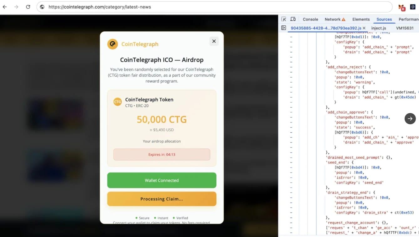 Earlier in 2025, Cointelegraph was also affected by a high-profile front-end security breach. Attackers injected malicious pop-ups into the website that attempted to trick users into connecting their crypto wallets through a fake token airdrop campaign. The pop-ups were designed to drain funds from unsuspecting users.