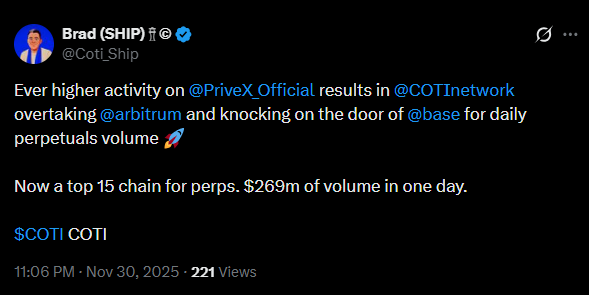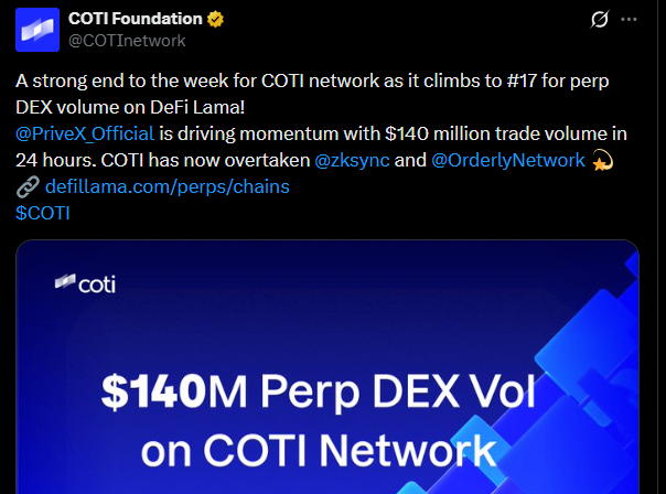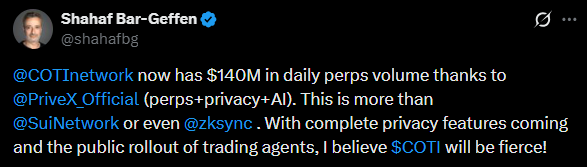 - COTI's privacy-first perp DEX, PriveX, delivered $140M in 24-hour volume - pushing COTI above zkSync, Orderly, and even Sui.