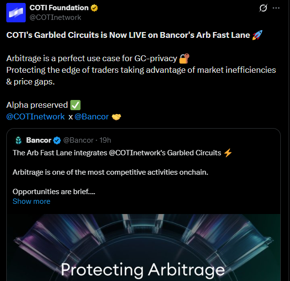 COTI commented on bancor’s X post and called it a "killer use case" and emphasizing that privacy-powered arbitrage trading is now live. In another post, the network noted that arbitrage is a perfect use case for GC privacy because it protects the trader's edge when exploiting market inefficiencies. COTInetwork said,