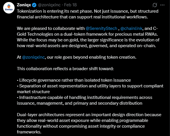 Separating these layers addresses one of the most persistent challenges in RWA tokenization. When ownership and utility exist within the same token, governance decisions can directly affect asset integrity. By splitting representation from functionality, the framework allows programmable financial logic without compromising the backing or compliance requirements associated with the underlying commodity. Zoniqx has highlighted this approach as part of a broader infrastructure move. In a recent post, the Zoniqx described its role as lifecycle governance and infrastructure capable of supporting issuance, management, and distribution across regulated environments.