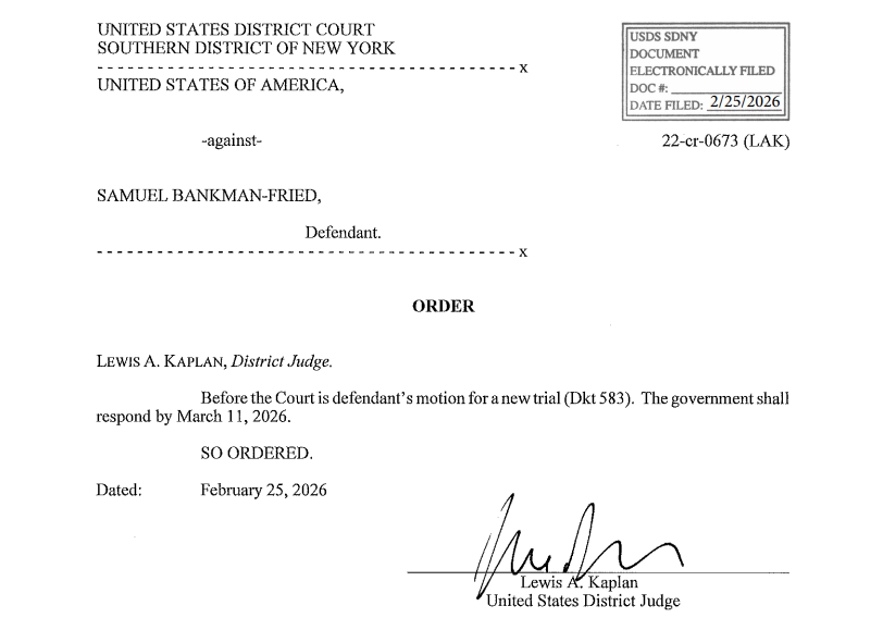 The legal battle surrounding Sam Bankman-Fried is far from over. In a fresh development, the US District Court for the Southern District of New York has given federal prosecutors two weeks to respond to the former FTX CEO's motion seeking a new criminal trial. In a Wednesday filing, Judge Lewis Kaplan directed that the US government must submit its response by March 11. The order relates to Bankman-Fried's recent request for a retrial, in which he claims that new witness testimony could help support his case.