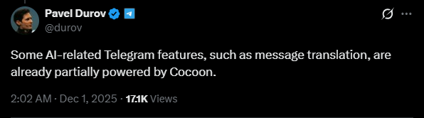 - Cocoon, Telegram's decentralized confidential compute network, is now live and already processing real AI requests.