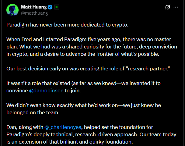 Paradigm's expansion into AI is not as sudden as it may seem. As early as 2023, observers noticed that the firm had removed certain Web3 and crypto-specific language from its website. That sparked speculation that it might be pivoting away from its crypto roots. At the time, co-founder and managing partner Matt Huang addressed those concerns directly. In a public post, he wrote: