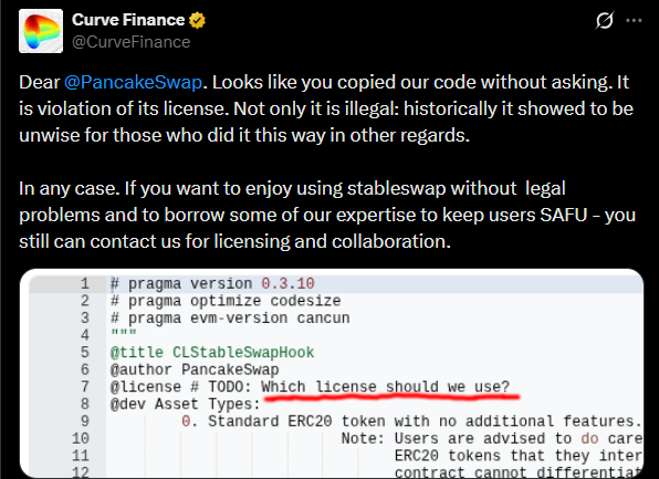 - Curve publicly stated the move violates its license but said PancakeSwap could still pursue a legitimate collaboration.