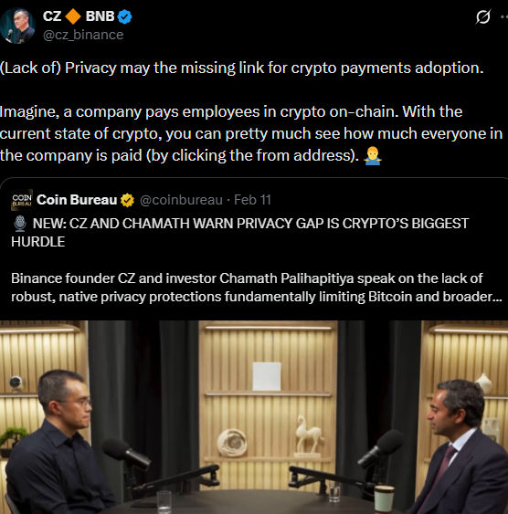 - CZ and Chamath Palihapitiya highlighted that lack of native privacy is limiting crypto payments from going mainstream.