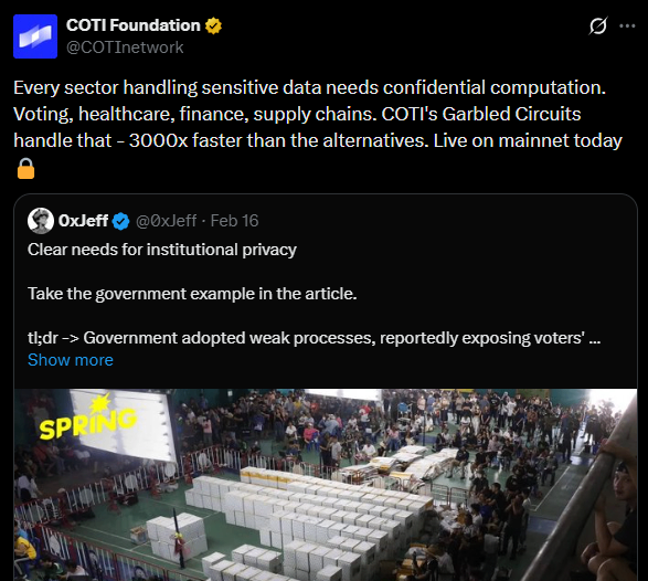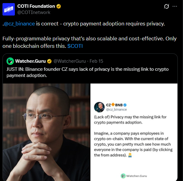 COTI noticed the discussion immediately and responded not just only to CZ, but to the broader industry conversation. The team retweeted: