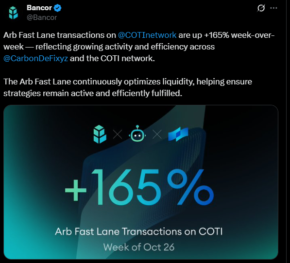 - Bancor's Arb Fast Lane optimizes liquidity in real time, with transactions on COTI up 165% week-over-week.