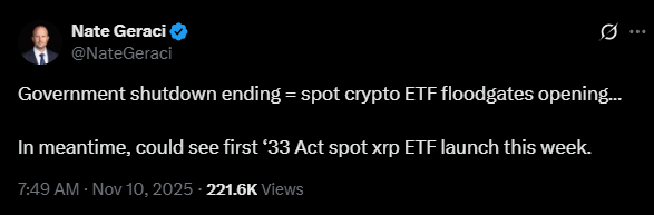 Geraci's comments reflect rising confidence among ETF observers that the SEC's new generic listing standards will allow XRP ETFs to automatically become effective once issuers update their S-1 filings and meet the rulebook criteria. The U.S. Senate's tentative agreement to end the ongoing government shutdown adds further momentum. The shutdown had significantly slowed the SEC's internal review capacity, delaying several pending ETF filings across multiple altcoins. If it ends this week, analysts believe the SEC's backlog will clear quickly.