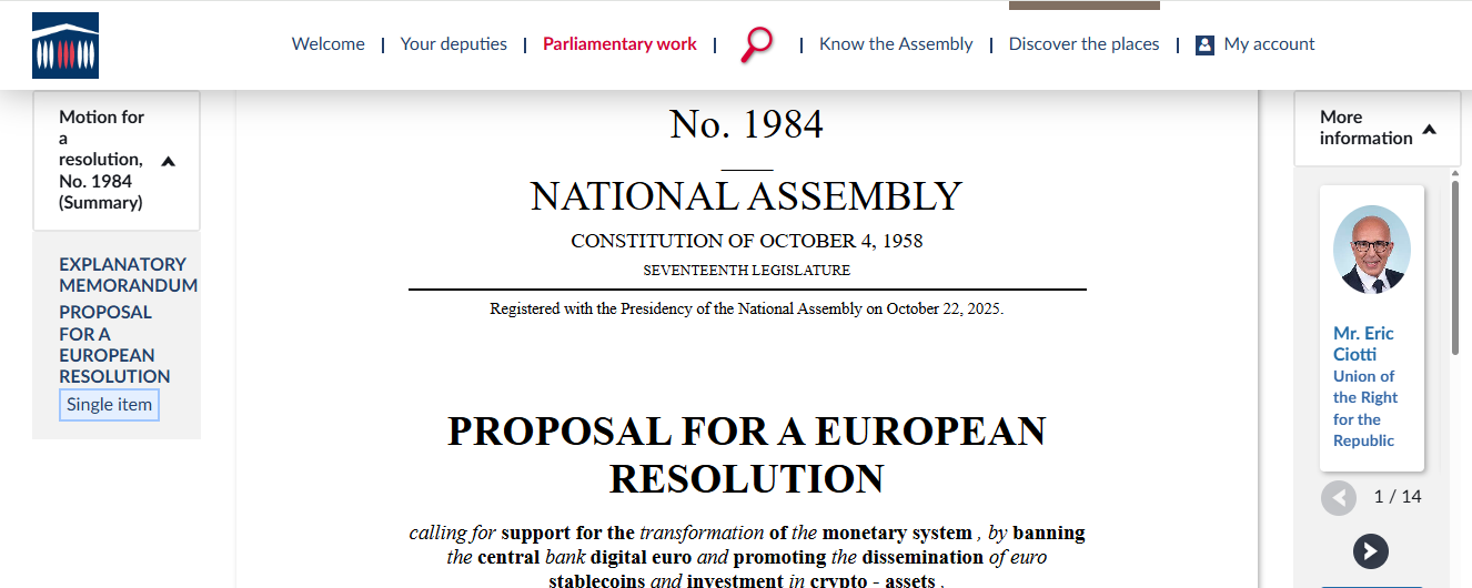On Wednesday , Éric Ciotti submitted a motion for resolution to the French National Assembly that outlines a radical rethink of France's approach to digital currency. The proposal urges the government to reject a state-issued digital euro, warning of risks to monetary sovereignty and financial freedom. Instead, the motion supports the promotion of "euro stablecoins" and increased investment in crypto-assets.