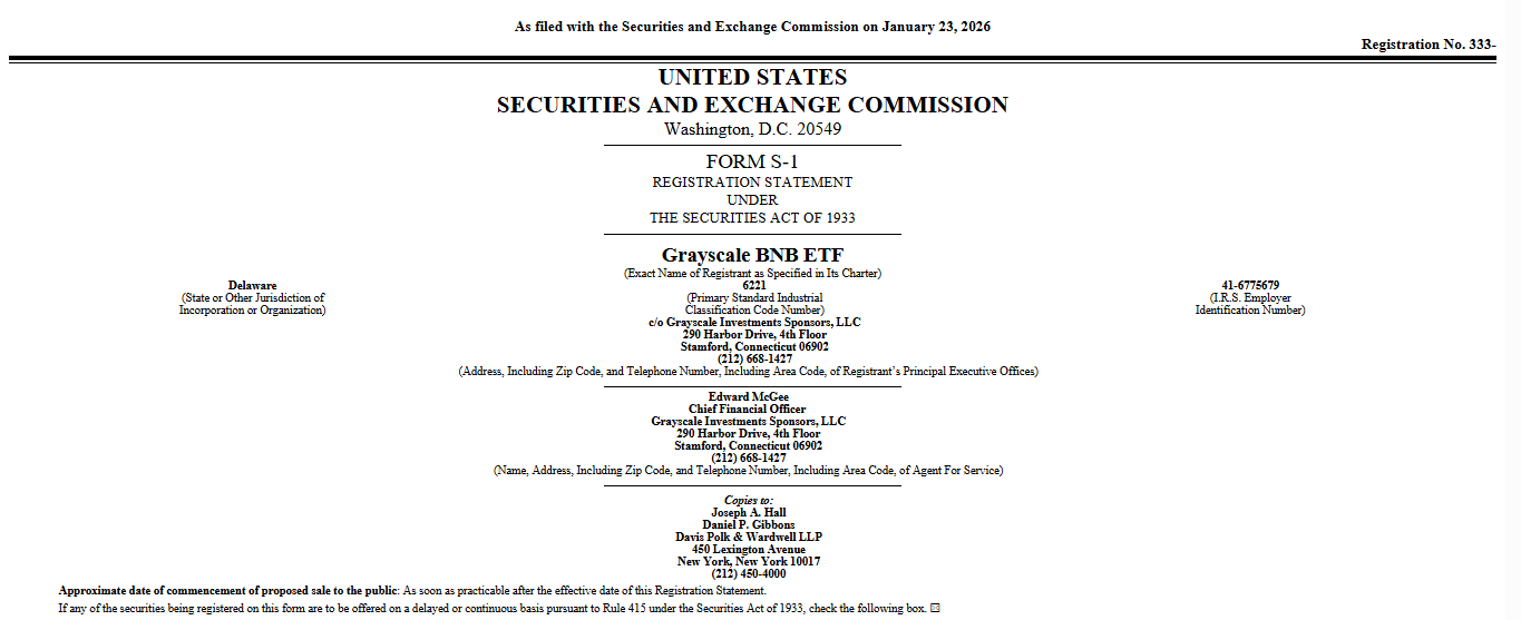 - Grayscale has filed a registration statement with the SEC for a BNB-based exchange-traded fund called the Grayscale BNB ETF.