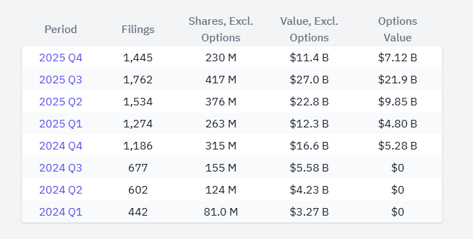 Data compiled from 13F filings with the SEC and analyzed by Todd Schneider at 13F.info shows that institutions reported owning 230 million IBIT shares in the fourth quarter, down significantly from 417 million in the third quarter.