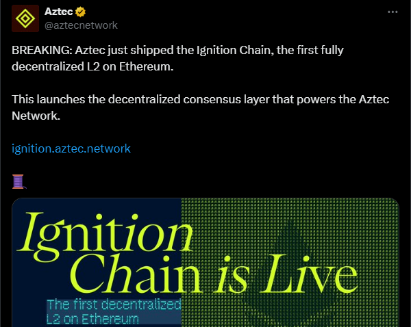- Aztec Network activated its Ignition Chain on Ethereum mainnet, marking its transition into a fully decentralized privacy Layer 2.