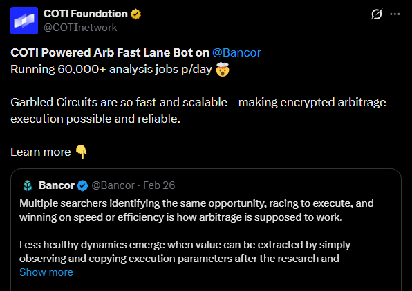 The Arb Fast Lane is Bancor's on-chain arbitrage trading bot. It continuously monitors price discrepancies across decentralized exchanges. When an opportunity is found, it computes a trade route and executes it but only if profitability thresholds are met. The challenge is that arbitrage thresholds, if visible, can be copied instantly by competing bots. COTI's solution is selective encryption. Sensitive execution inputs such as profitability thresholds are encrypted before broadcast. Smart contracts still enforce the conditions but the thresholds themselves are never revealed to competitors. COTI recently highlighted the scale and said: