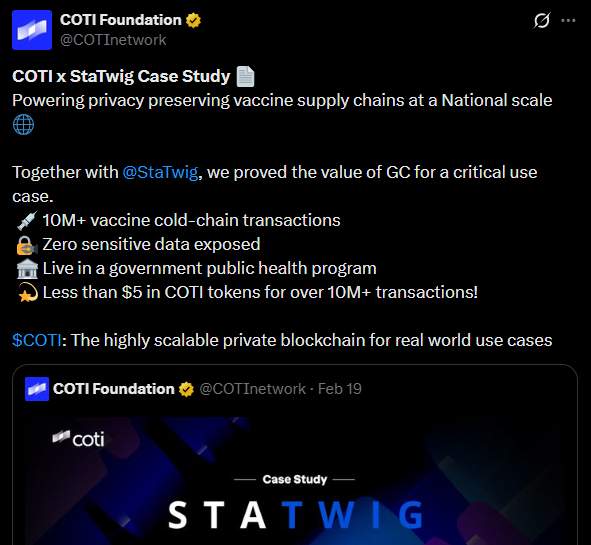 Individually, each of these developments is impressive. But together, they demonstrate something broader: COTI's privacy infrastructure is functioning across three entirely different domains. They represent government use, market-driven adoption, and protocol-level infrastructure. In Bangladesh, a government public health program processed over 10 million vaccine cold-chain transactions in a month. Sensitive health data stayed encrypted the entire time. The system worked, and officials validated it.