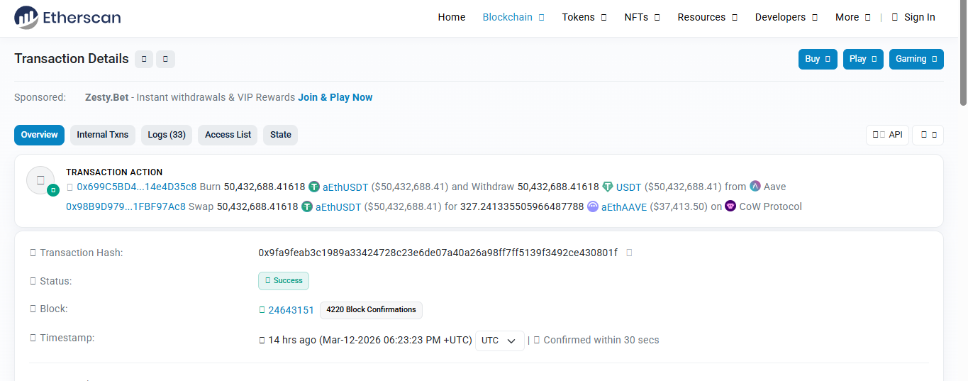 A single cryptocurrency trade worth more than $50 million has turned into one of the most talked-about incidents in decentralized finance this year after a user lost nearly the entire amount during a token swap. The transaction involved converting $50.4 million worth of Tether USD (USDT) into the governance token of Aave through the decentralized exchange aggregator CoW Protocol and the decentralized exchange SushiSwap. According to blockchain data from Etherscan, the wallet executing the trade had recently been funded from Binance before initiating the swap. The intention appeared straightforward: convert the entire USDT balance into AAVE tokens. However, the final outcome was dramatically different from what the user likely expected. Instead of receiving tens of millions of dollars worth of AAVE tokens, the wallet received only 327 AAVE tokens, valued at roughly $36,000 at the time.