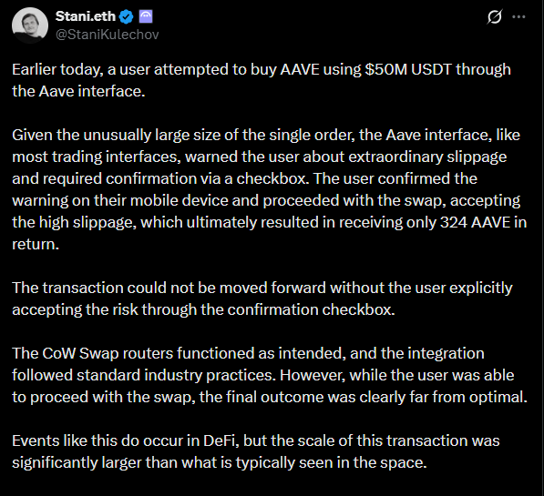 - Stani Kulechov said the user confirmed a warning about "extraordinary slippage" before proceeding.