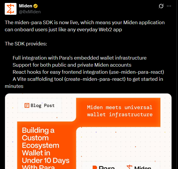 Miden just crossed an important line that the miden-para SDK is now live, and it quietly removes one of the biggest frictions in crypto apps: wallet onboarding. In a recent post, Miden added that "The miden-para SDK is now live, which means your Miden application can onboard users just like any everyday Web2 app” Until now, building on advanced zero-knowledge infrastructure often meant asking users to deal with seed phrases, browser extensions, and flows that feel foreign to anyone outside crypto. This integration changes that dynamic by connecting Miden's privacy-focused system with Para's embedded wallet stack.