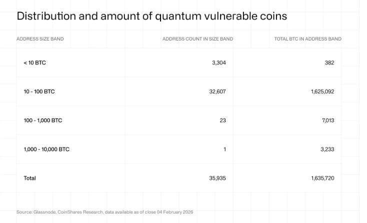 Christopher Bendiksen, Bitcoin research lead at CoinShares, framed the situation as a limited, targeted issue rather than a system-wide failure. His view is that the coins at meaningful risk are a small slice of the total. He noted that a little over 7,000 BTC sit in wallets with between 100 and 1,000 BTC, while roughly 3,230 BTC are in wallets with 1,000 to 10,000 BTC. At current prices, that group of coins adds up to hundreds of millions of dollars. In traditional market terms, that size could resemble a large but not catastrophic trade. This does not mean there is no risk. It means the risk has boundaries. It is concentrated in specific address types and wallet structures.