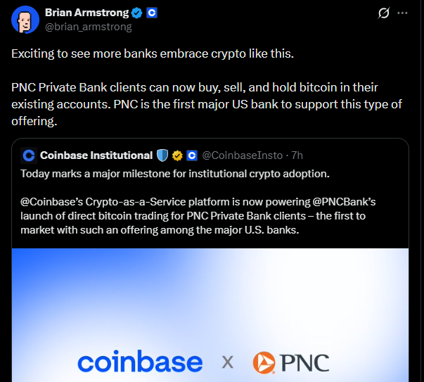 Shortly after the announcement, Coinbase CEO Brian Armstrong posted on X about the collaboration. His message was brief, but it captured the broader mood across the industry. Armstrong wrote that it was "exciting to see more banks embrace crypto like this," adding that PNC Private Bank clients can now "buy, sell, and hold bitcoin in their existing accounts," and he highlighted that PNC is the first major bank in the U.S. to support this kind of offering.