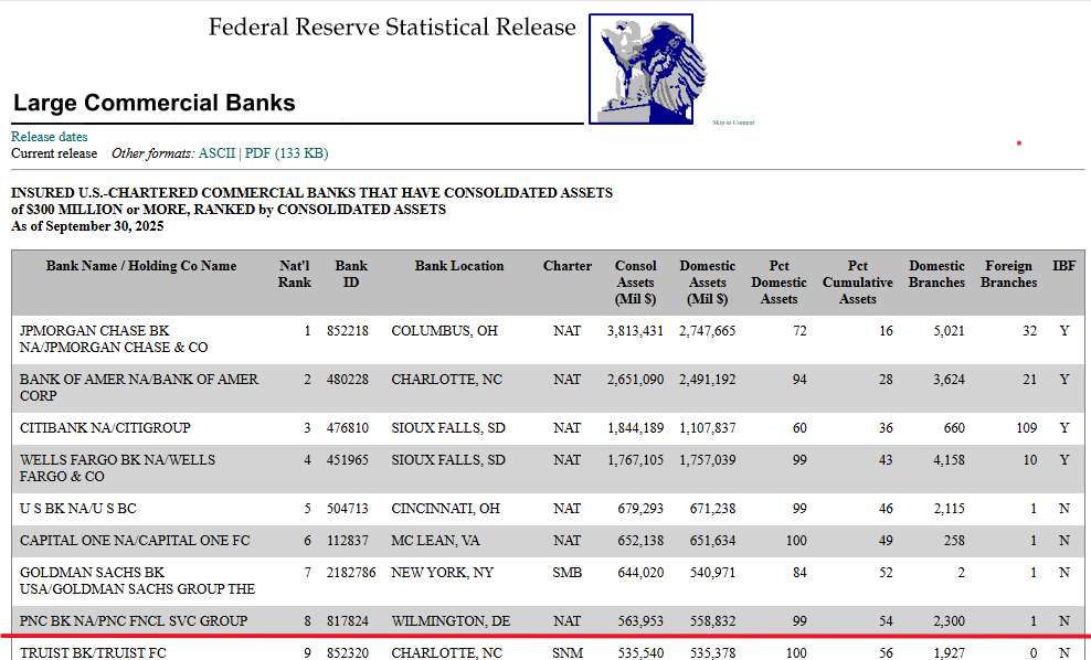 According to the U.S. Federal Reserve's latest data, PNC ranks as the eighth-largest commercial bank in the country, managing roughly $564 billion in assets and operating more than 2,300 branches nationwide.