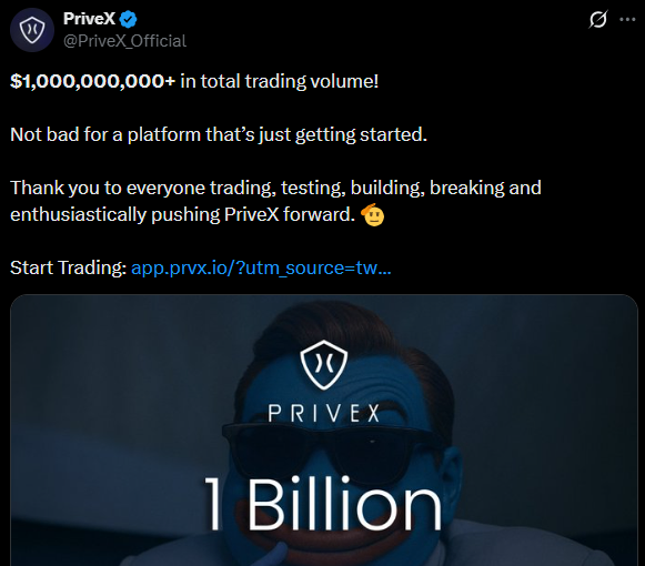 - PriveX continues rapid growth, crossing 1,000,000 total trades and $1B+ in cumulative trading volume within months of launch.