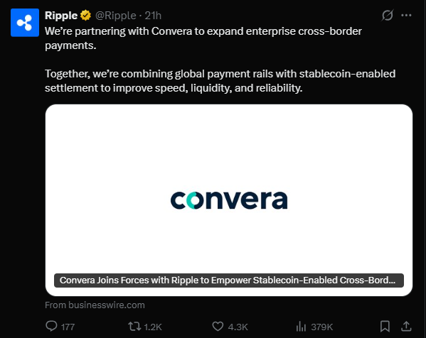 Ripple is doubling down on real-world payments, the company has partnered with Convera, a global fintech firm, to bring stablecoin-powered infrastructure into cross-border transactions. Convera, formerly known as Western Union Business Solutions, handles payments across more than 140 currencies and operates in close to 200 countries. It means this partnership is designed for scale.