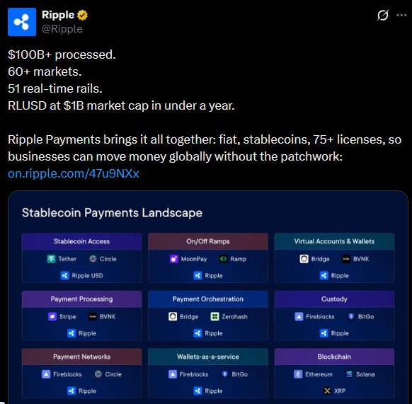 - Ripple says it has processed over $100 billion in transactions, while its stablecoin RLUSD has surpassed a $1 billion market cap since launching in December 2024.