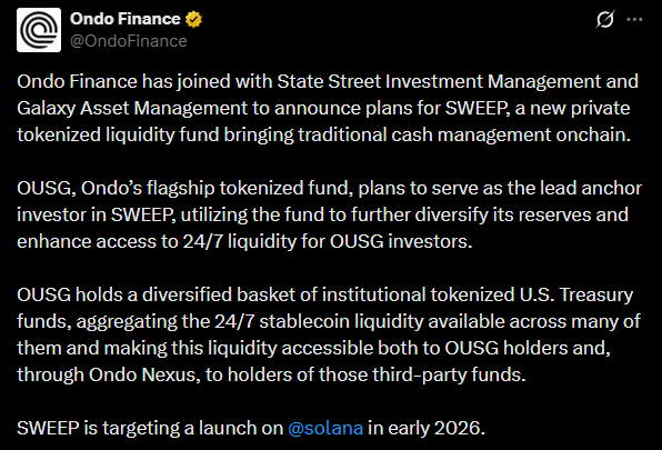 Launching on Solana first, with expansion planned for Stellar and Ethereum, the SWEEP fund is designed to operate across the ecosystems where stablecoins, tokenized treasuries, and real-world assets (RWAs) are already being actively used.
