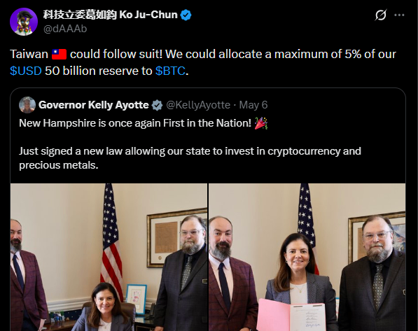 - Lawmaker Ko Ju-Chun is urging Taiwan to consider Bitcoin as part of its national reserves, proposing up to 5% of the nation's US$50B reserves in BTC.