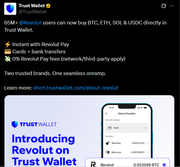 For users, the biggest advantage is convenience. Buying major crypto assets becomes as simple as a few taps inside Revolut and Trust Wallet, all without paying additional fees.