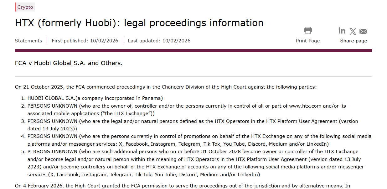 The United Kingdom's financial regulator is escalating enforcement against a high-profile crypto exchange over how it markets its services to British consumers. On Tuesday the Financial Conduct Authority said it has launched court action against HTX, formerly known as Huobi global in the Chancery Division of the High Court, alleging that the exchange illegally promoted cryptocurrency asset services in breach of the UK's advertising rules.The FCA first began proceedings in October 2025, naming HUOBI GLOBAL S.A., a company incorporated in Panama, and a series of "Persons Unknown" linked to the ownership, operation and promotion of the HTX platform and its social media presence. The list of unidentified parties includes persons controlling HTX's promotions across a range of popular social platforms and messaging services, including X, Facebook, Instagram, Telegram, TikTok, YouTube, Discord, Medium and LinkedIn.