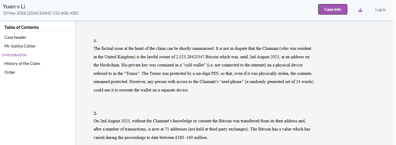 A legal dispute in the United Kingdom has brought attention to one of the largest alleged personal crypto thefts ever presented in court. A UK resident has accused his estranged wife of secretly accessing his hardware wallet and transferring 2,323 Bitcoin, valued at roughly $176 million, without his permission. The case was detailed in a judgment issued by Justice Cotter in the High Court of Justice. According to the filing, the claimant, Ping Fai Yuen, alleges that his wife Fun Yung Li and her sister secretly recorded him using a security camera to capture the sensitive recovery phrase that controls access to his digital assets. The recovery phrase, often referred to as a seed phrase, is the master key used to restore a crypto wallet. Anyone with access to it can take control of the funds stored inside the wallet.