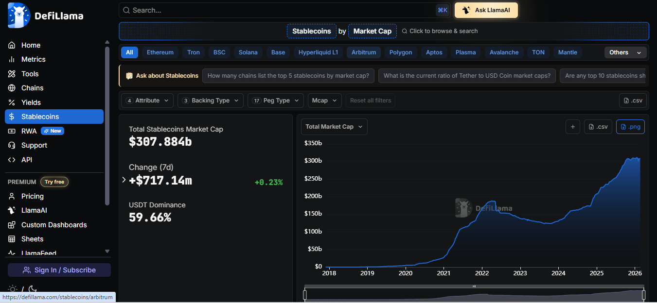 Interestingly, the retreat in USDT has not spilled over into the broader dollar-linked stablecoin market. Data from DeFiLlama shows that the total combined market capitalization of stablecoins has actually increased by about 2.33% so far in February. The figure has moved from roughly $300 billion at the start of the month to around $307 billion. That suggests the current trend may be repositioning within the stablecoin segment itself.