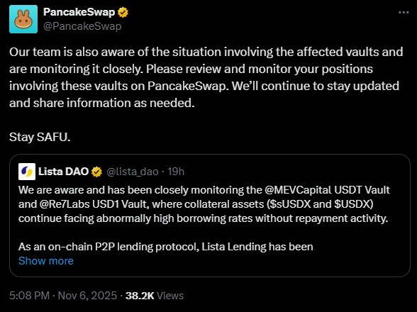 The fallout has touched several major DeFi ecosystems, including Lista DAO and PancakeSwap, both of which have begun issuing guidance, monitoring affected vaults, and coordinating mitigation steps. What began as a sudden drop has now escalated into a full-scale ecosystem stress test, with questions mounting around USDX's model, its exposure to recent exploits, and the silence from its issuer.