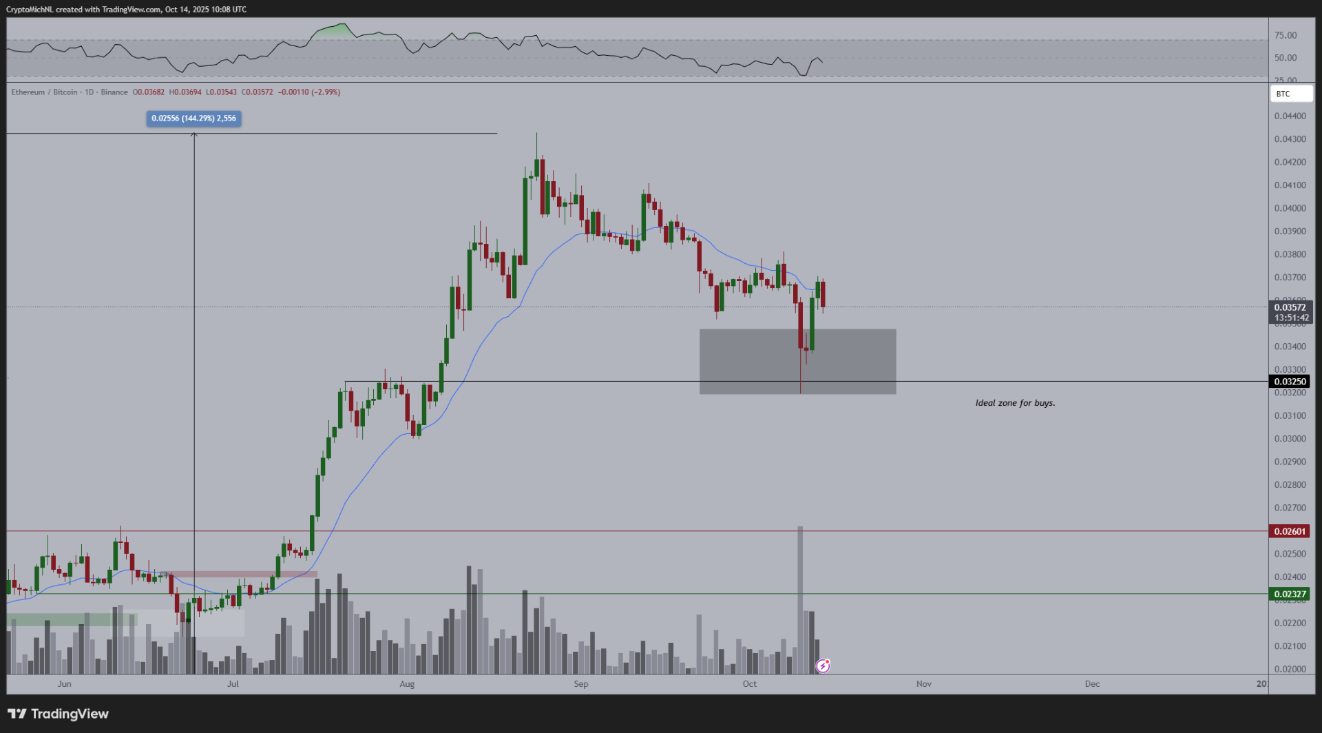 Many altcoin bulls watch the ETH/BTC pair for confirmation. Michael van de Poppe, founder of MN Capital, noted ETH/BTC recently dropped to 0.032, calling that an "ideal zone for buys" and potentially signaling a trend switch.