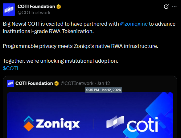 COTI has announced a new partnership with Zoniqx, a Silicon Valley fintech focused on institutional-grade RWA tokenization. The collaboration aims to combine two complementary strengths: Zoniqx's compliance-native tokenization infrastructure and COTI's programmable privacy technology.